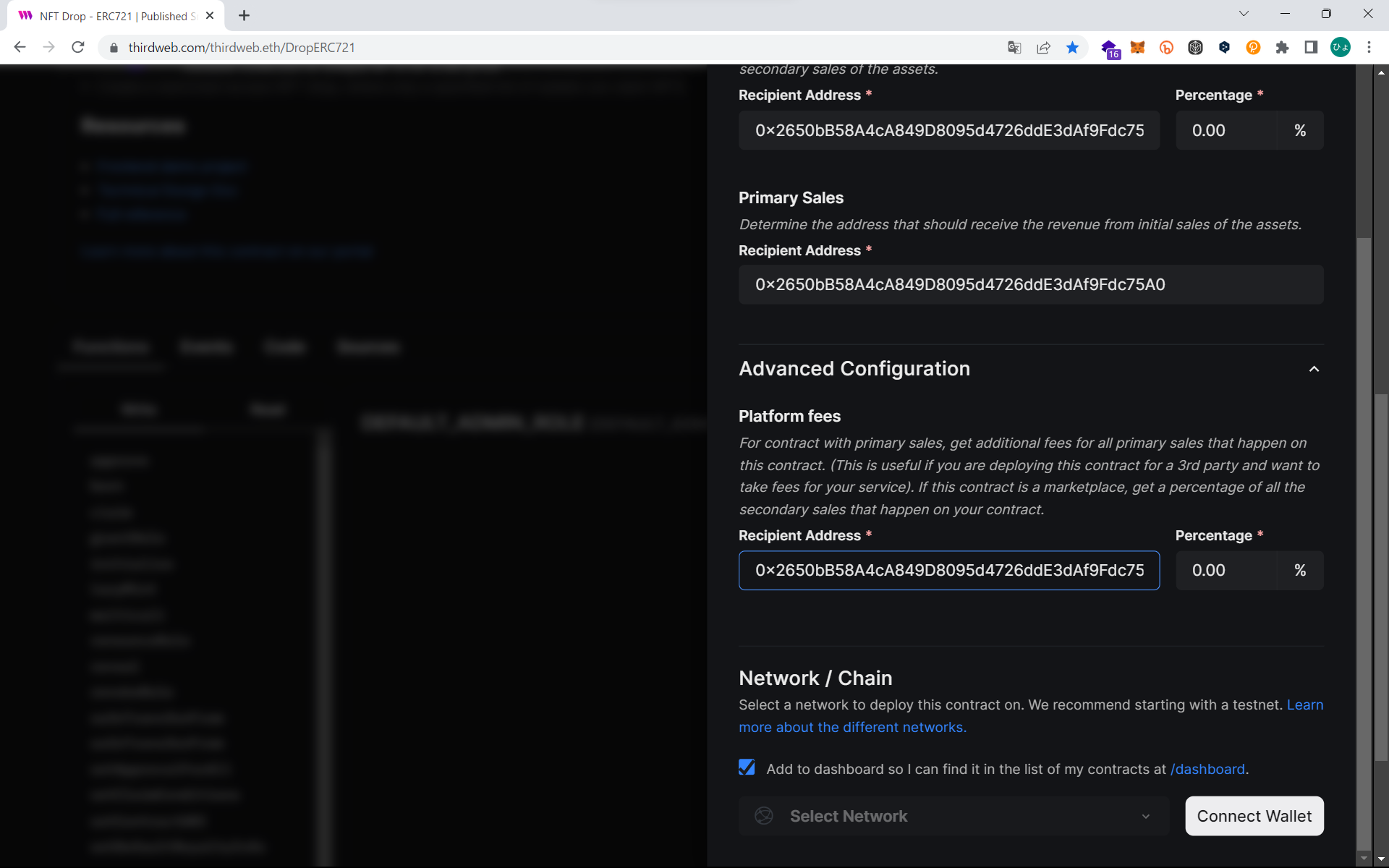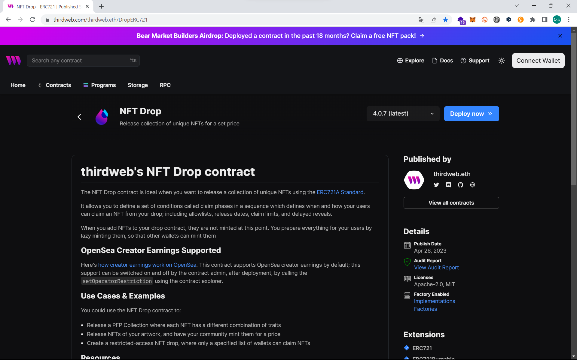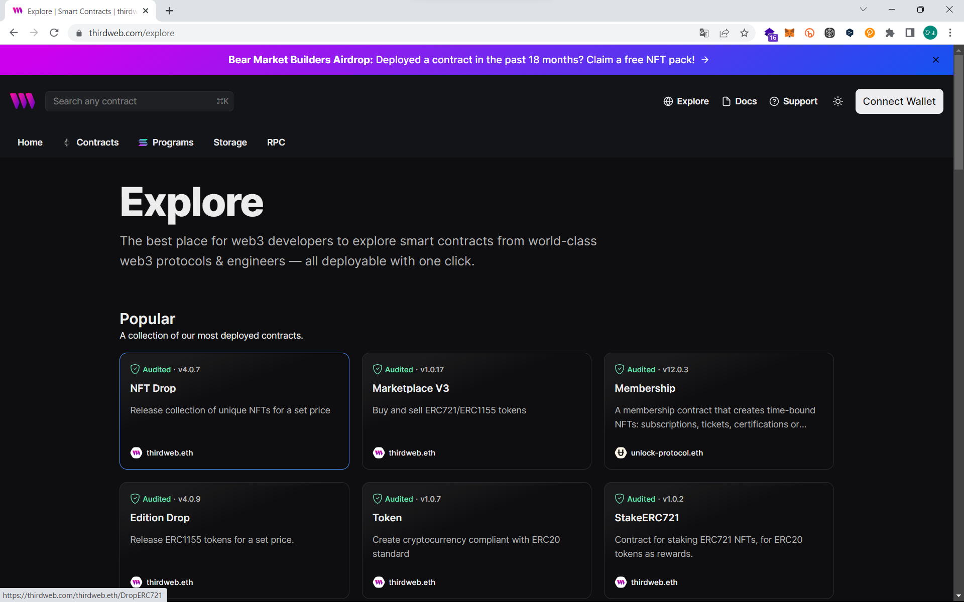 そうすると、画面右下に [Connect Wallet] のボタンがあるので、自身のウォレットをthirdwebサイトに接続してください。