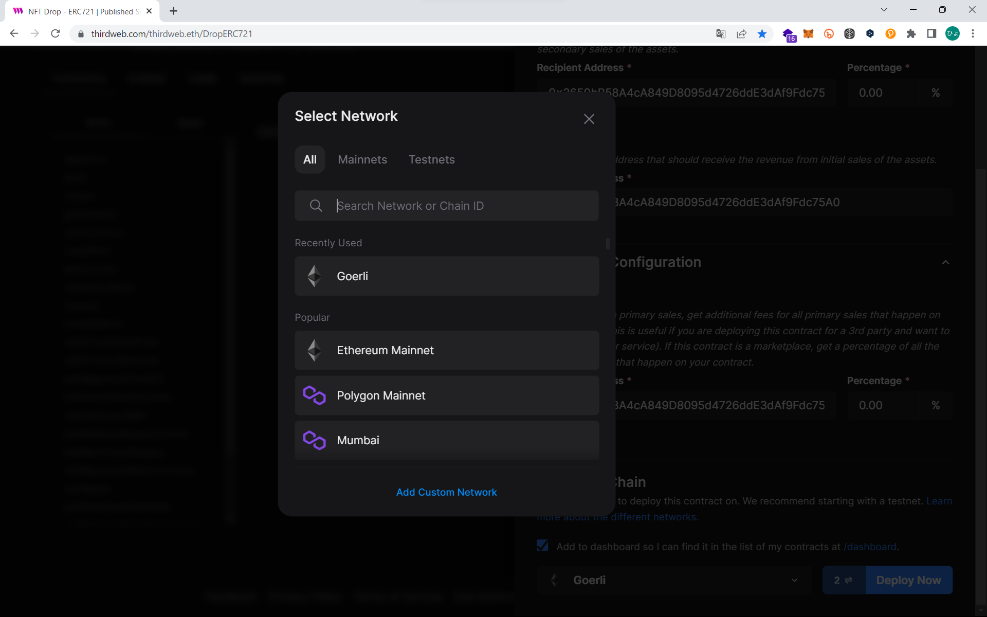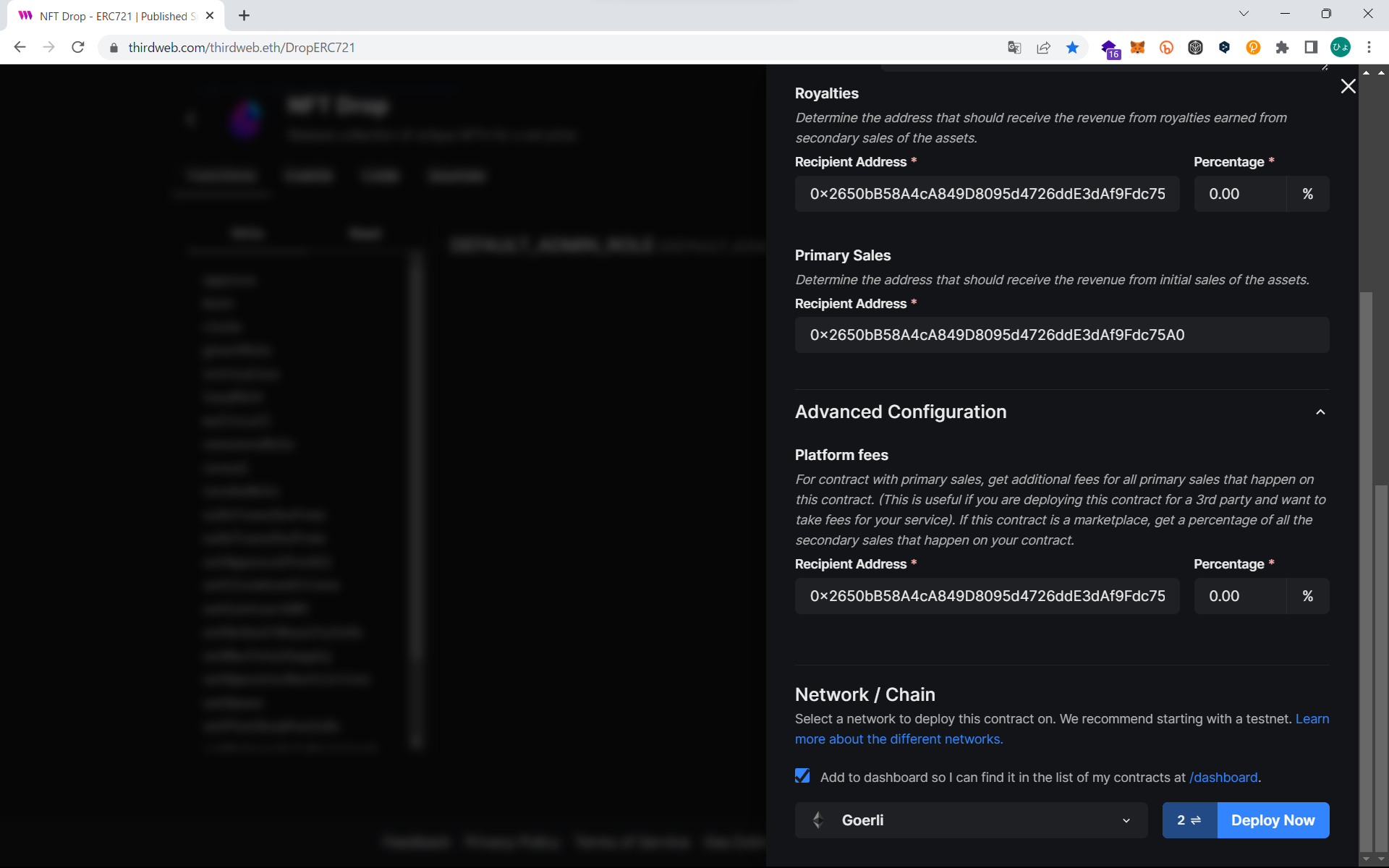 7. ウォレット接続が完了したら、[Deploy Now] を押下※ボタン左側の利用ネットワークをイーサリアムのテスト用 (Goerli) に変更。
