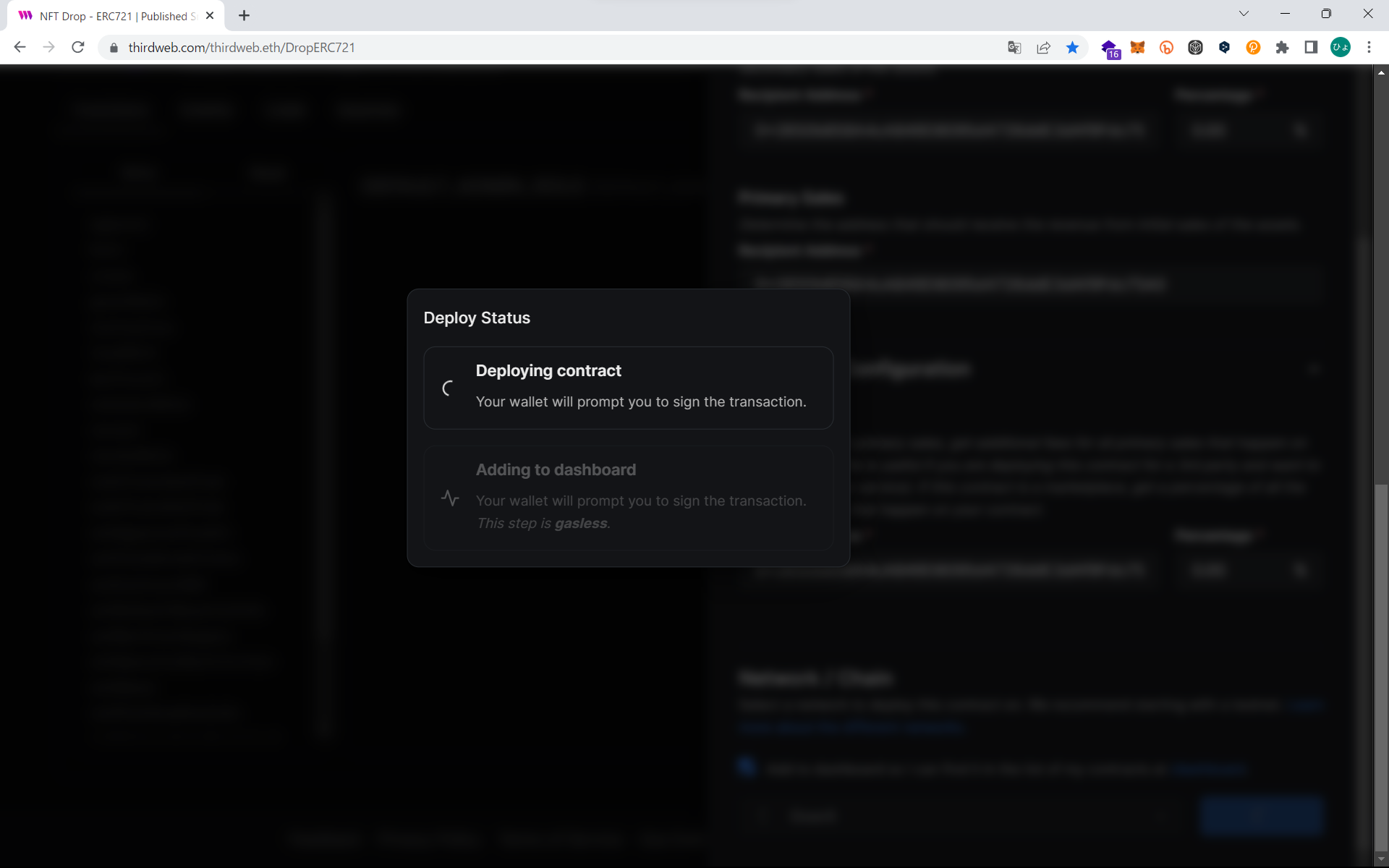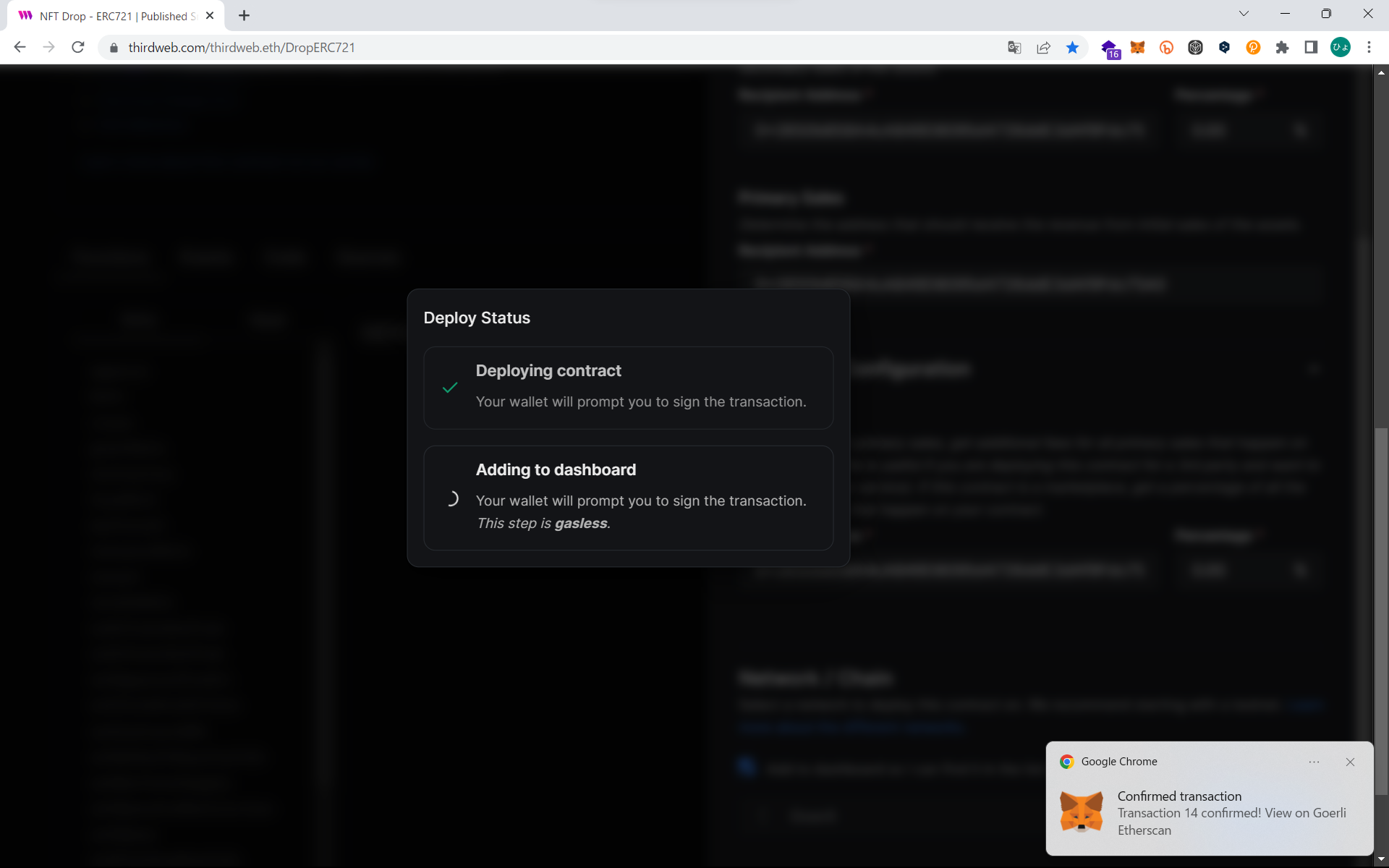 デプロイ完了後は、引き続き、ダッシュボードへ追加の処理が続きます。この処理にはガス代が不要の様です。