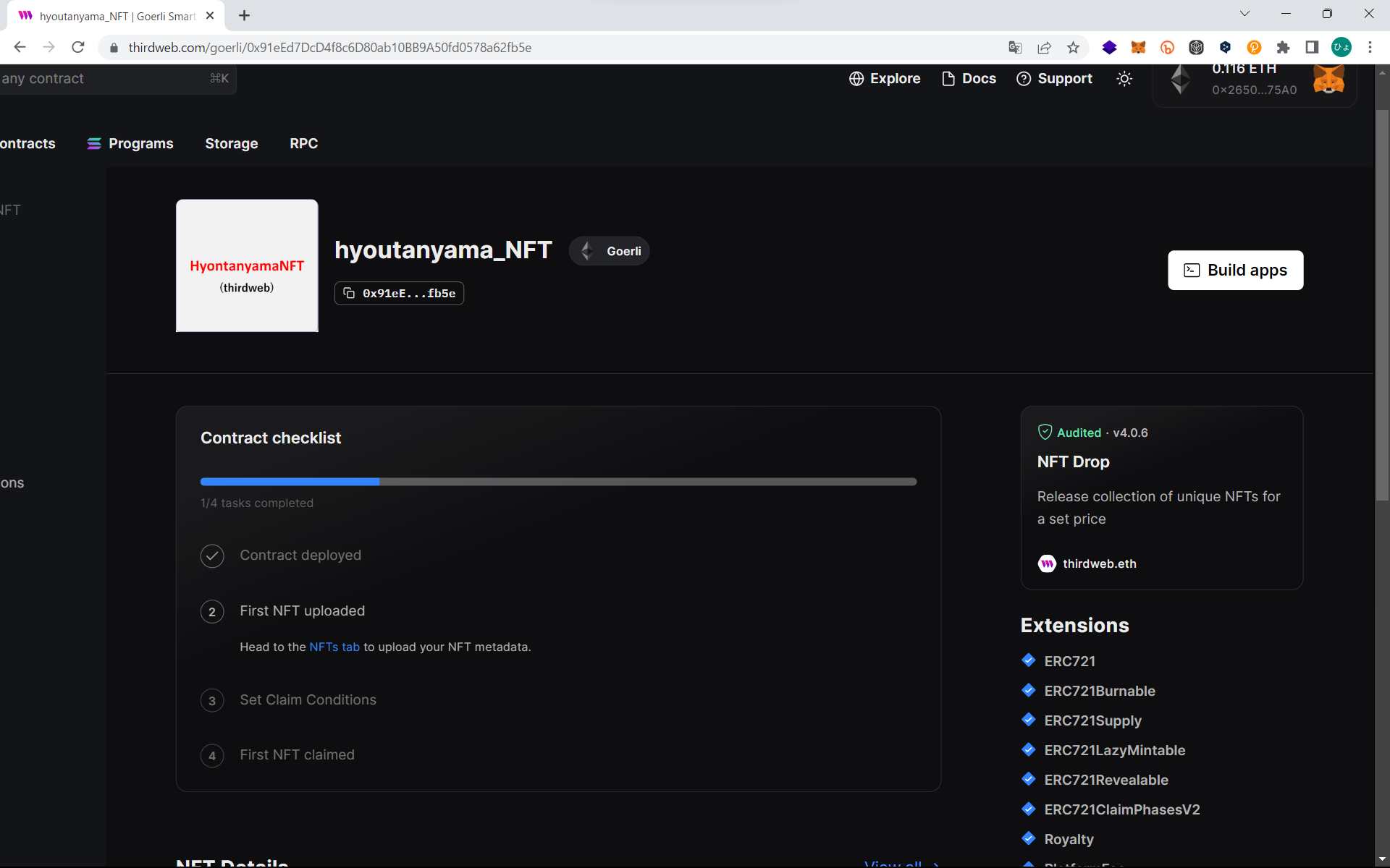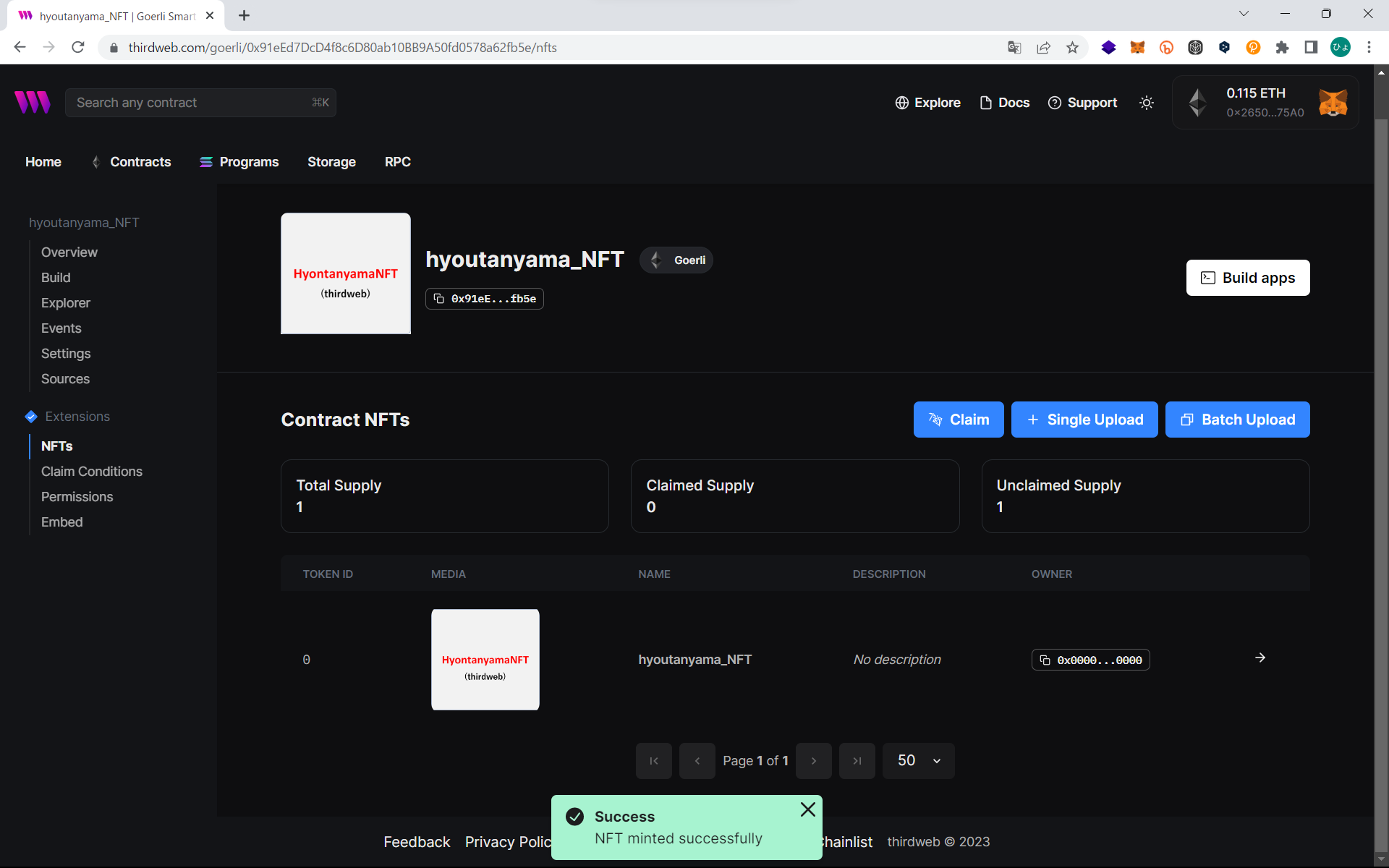 処理が完了し「Contract NFTs」に登録済の画像が表示されました。以下の状態を示しています。
