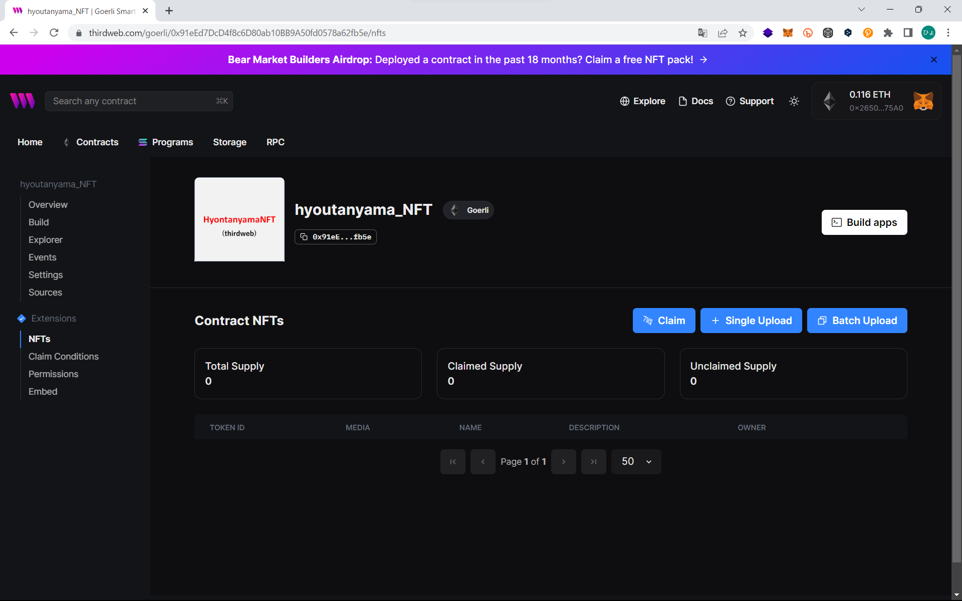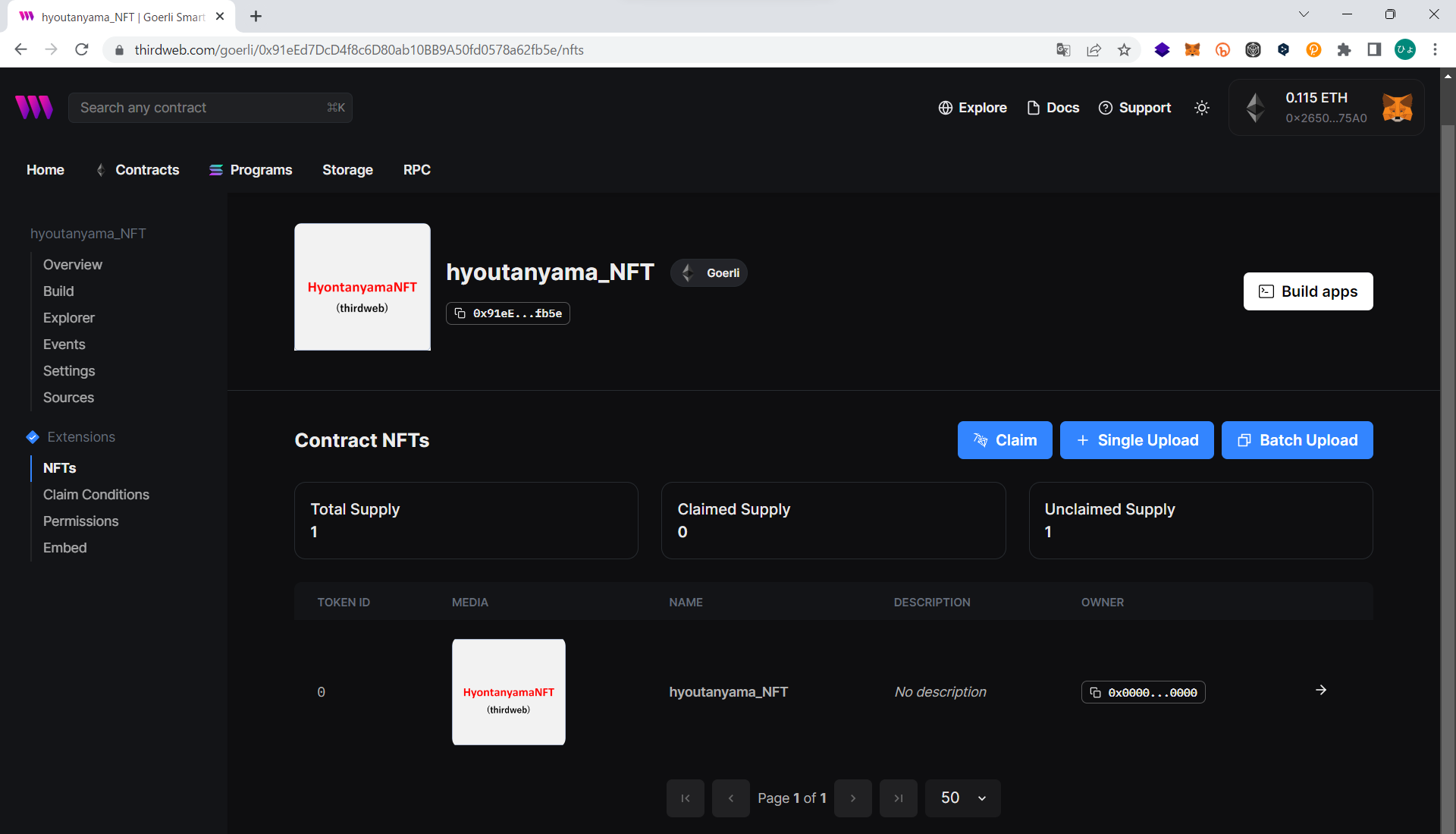 ※ [Batch Upload] は、複数枚の登録が可能のようですが、今回は単一の登録をします。 また、[Claim] を押下するとこの時点ではエラーになります。