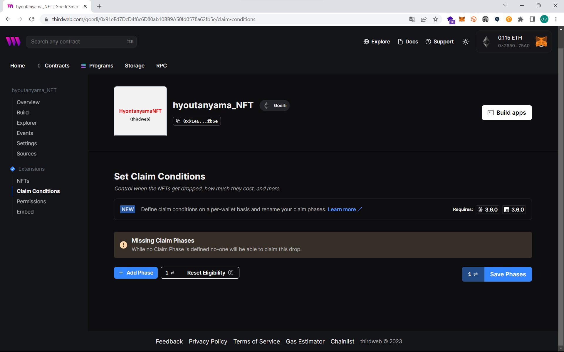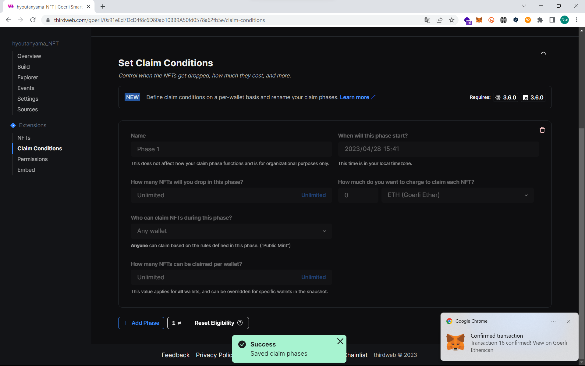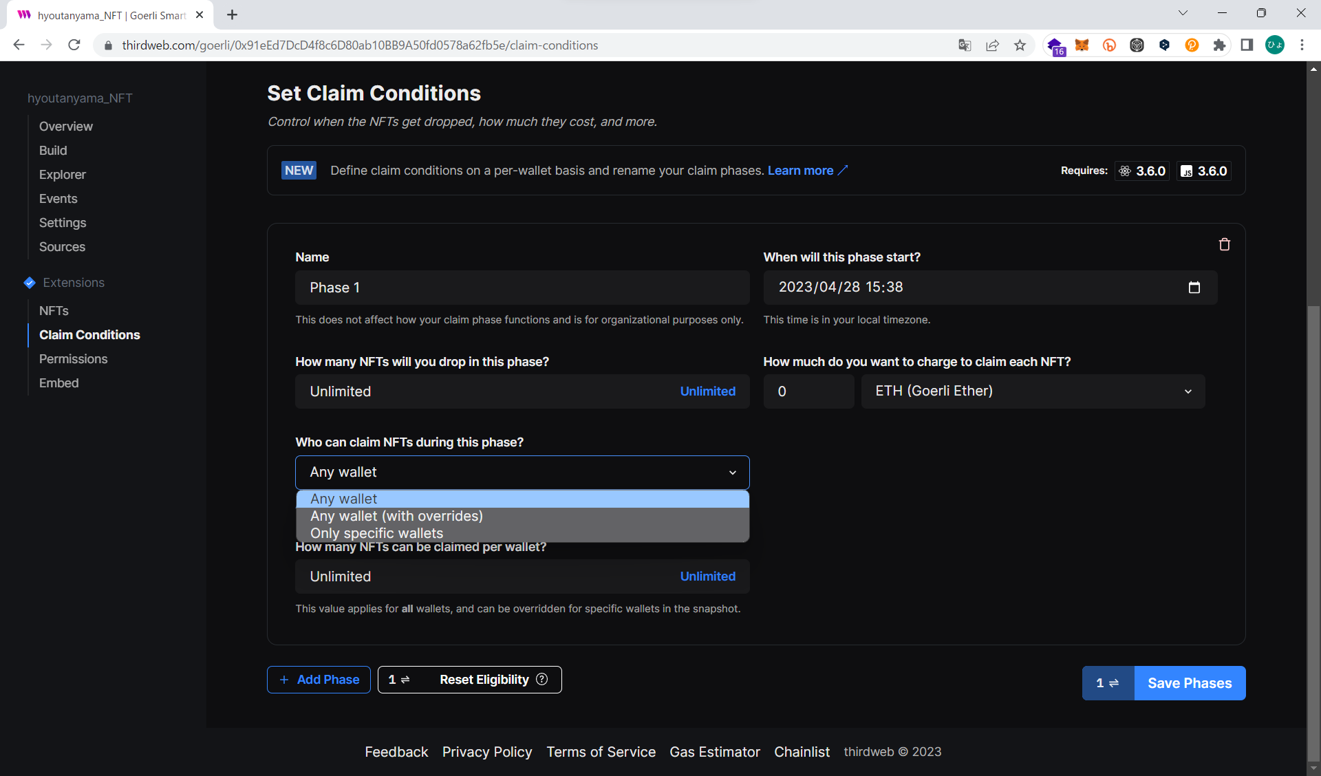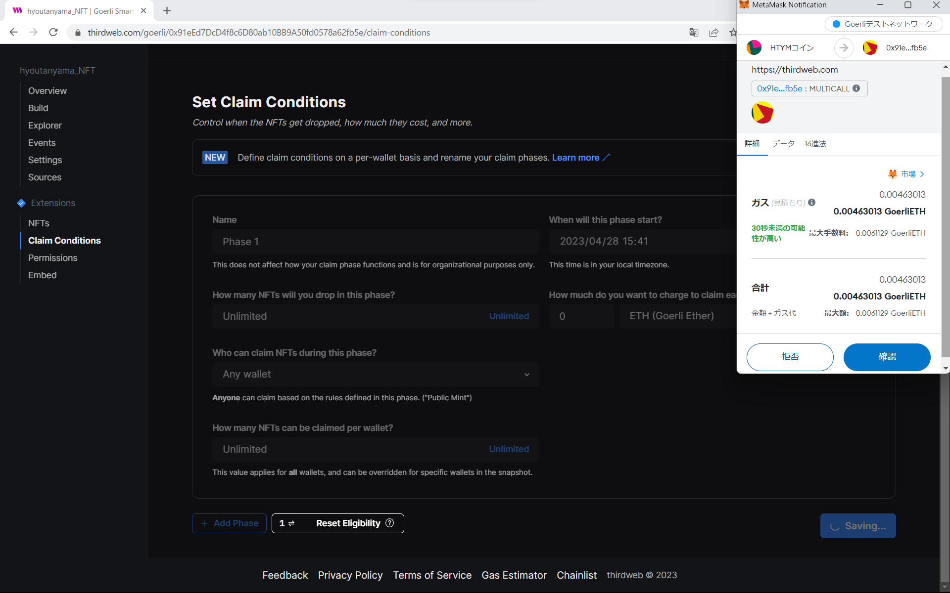 - 「thirdweb」内の管理画面で公開時間や金額などの設定