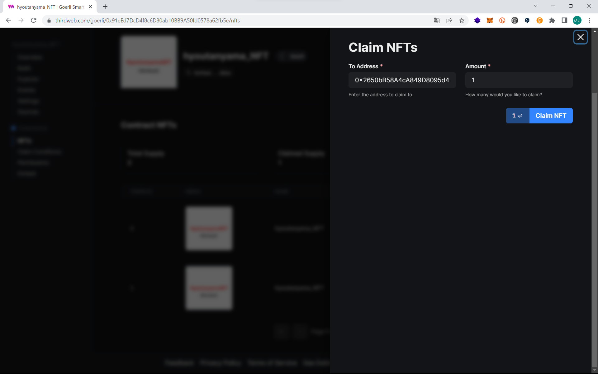 18. [Claim NFT] を押下 ※どのアドレスから購入するか?何枚か?は、設定できます。枚数については登録した画像の枚数以上は購入できません。