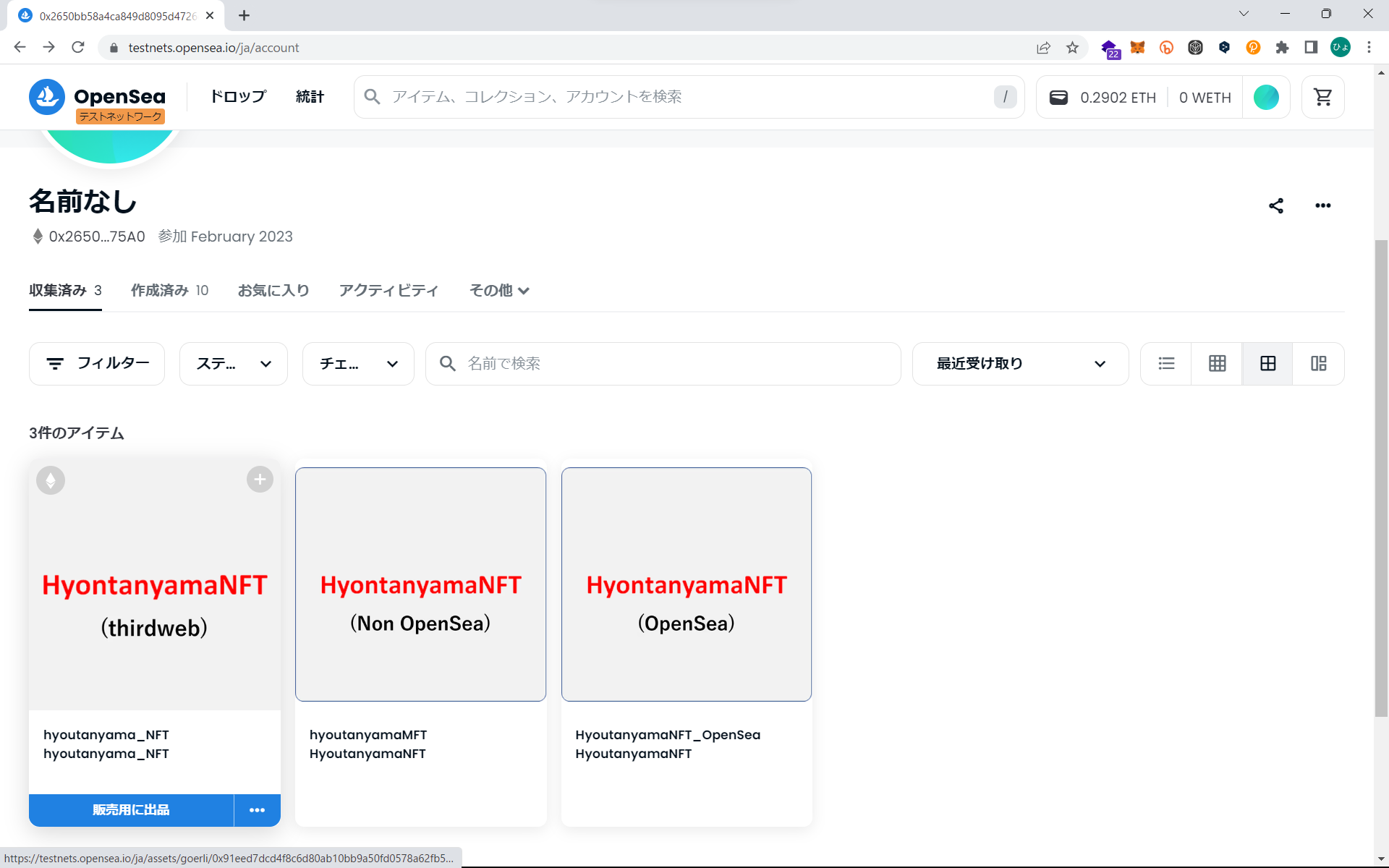 はい。というわけで「thirdweb」のサービスからNFTを発行し、購入することができました。Openseaのサイトでも確認ができます。