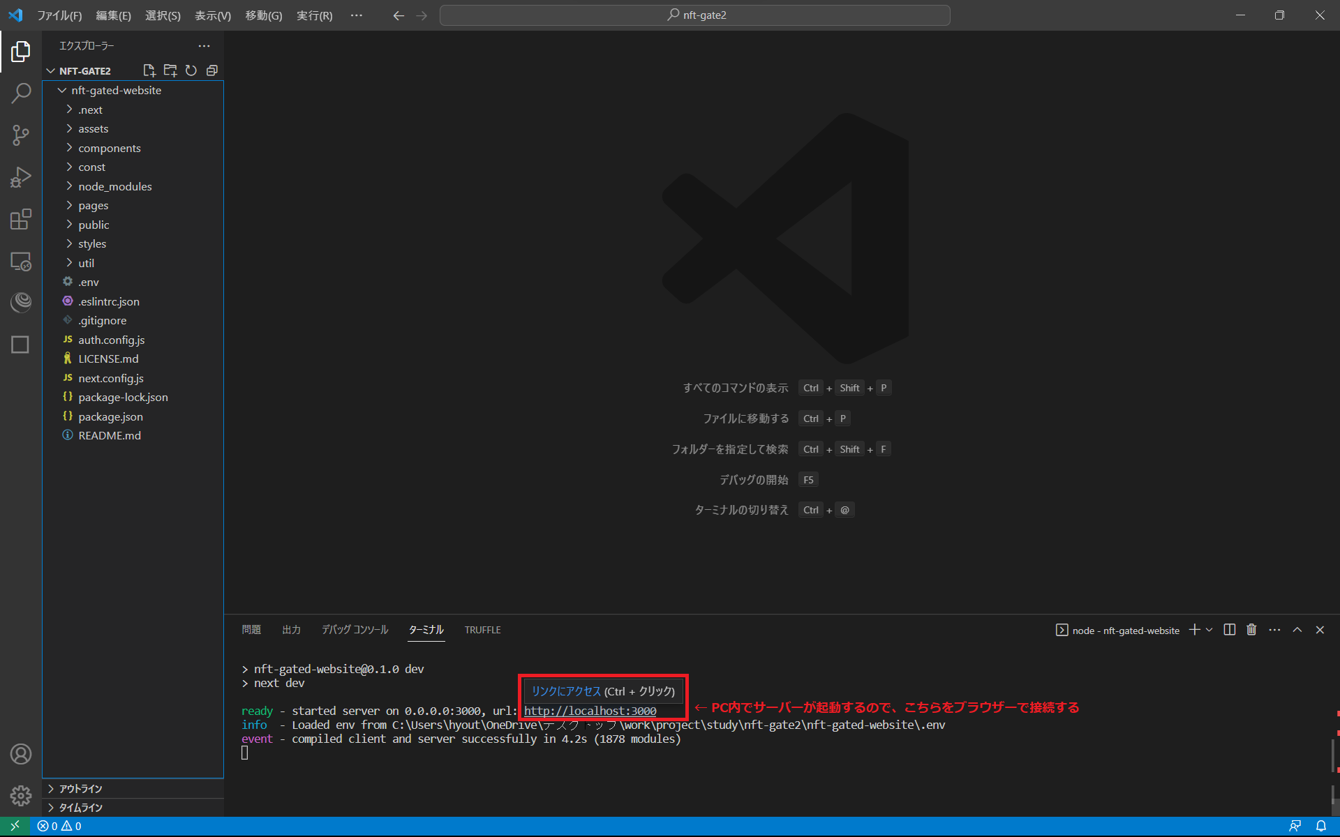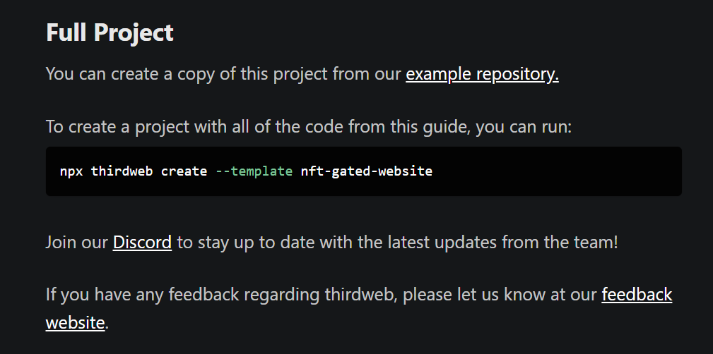 npx thirdweb create --template nft-gated-websiteしばらく待っていると、作業用ディレクトリ内に必要なファイル一式がダウンロードされます。