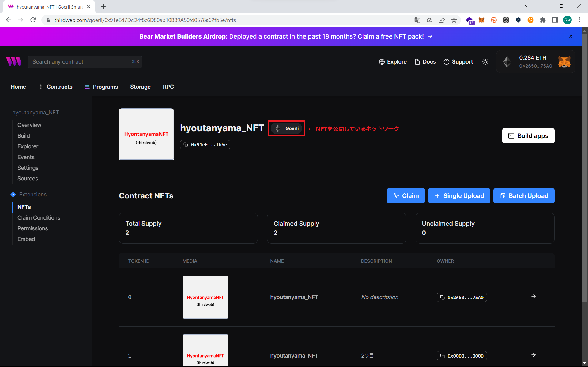 前回の記事に書いたNFTミントサイト「NFT Drop」を使用します。ここで使ったコントラクトアドレスや登録ウォレットの秘密鍵を連携。