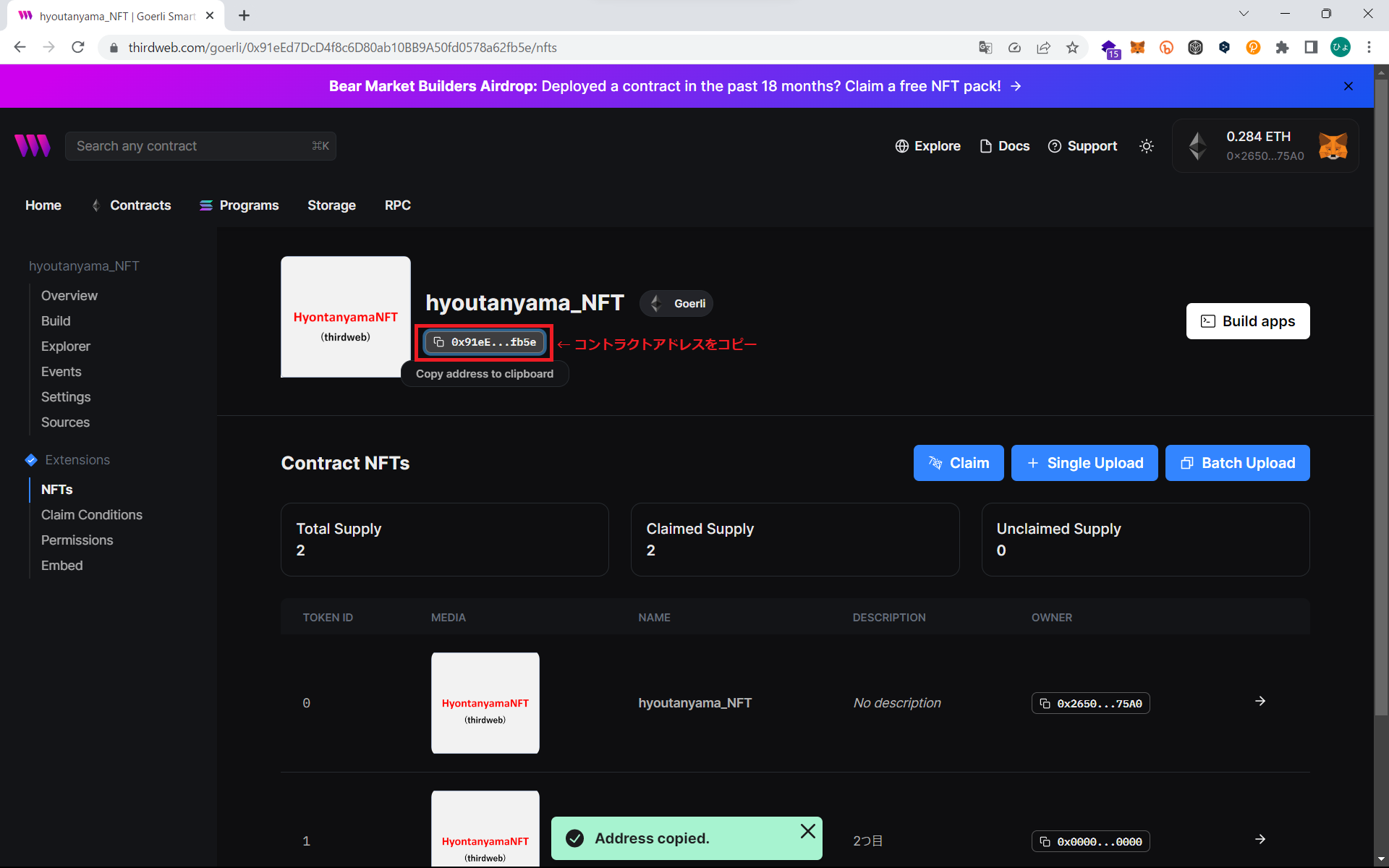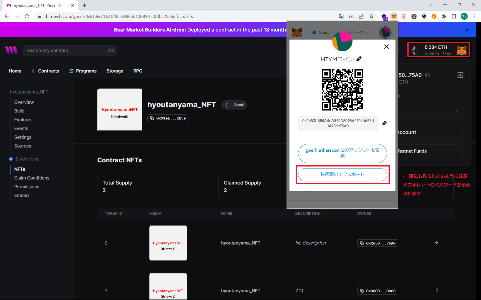 1: THIRDWEB_AUTH_PRIVATE_KEY=(ここに秘密鍵を入力)「NFT Drop」を作成したときに接続したウォレットの秘密鍵 (プライベートキー) をMetaMaskの設定から調べます。※公開アドレスと秘密鍵が揃うと乗っ取られます。情報漏洩に気を付けて下さい。