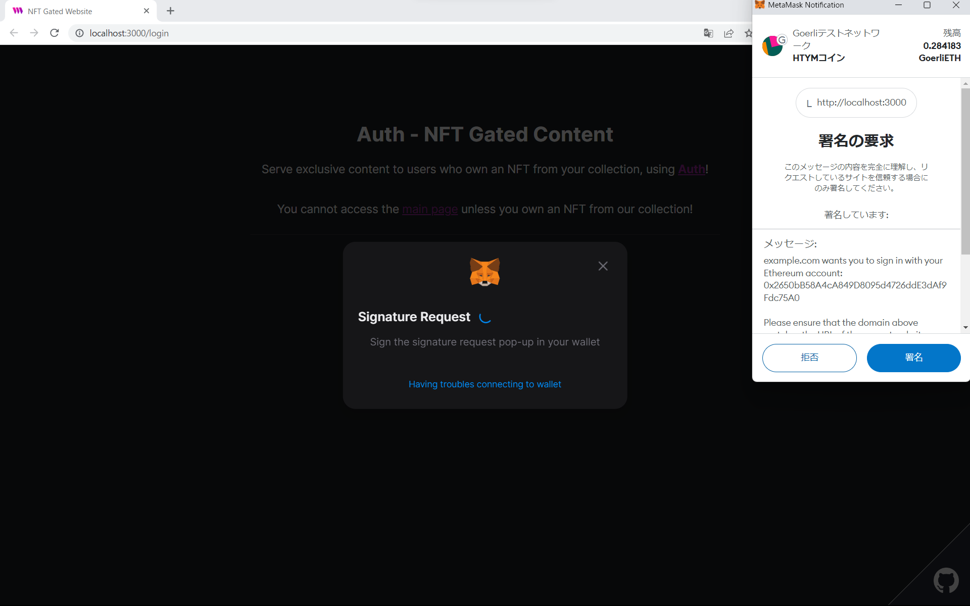 MetaMaskが起動し署名を求められるので [署名] を押下します。