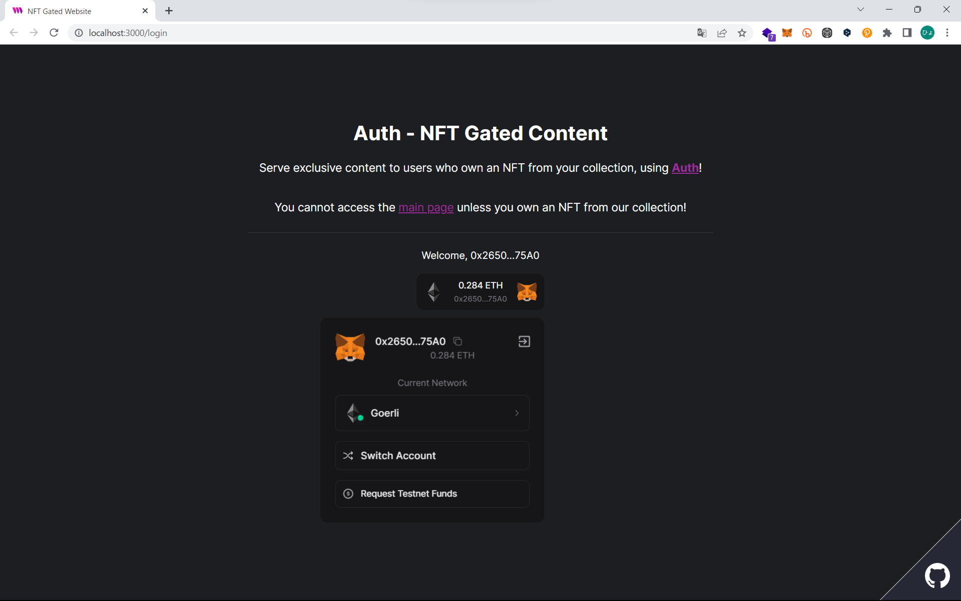 これで、ログイン画面とウォレットの接続が完了しました。この状態で、文中のテキストリンク [main page] を押下します。