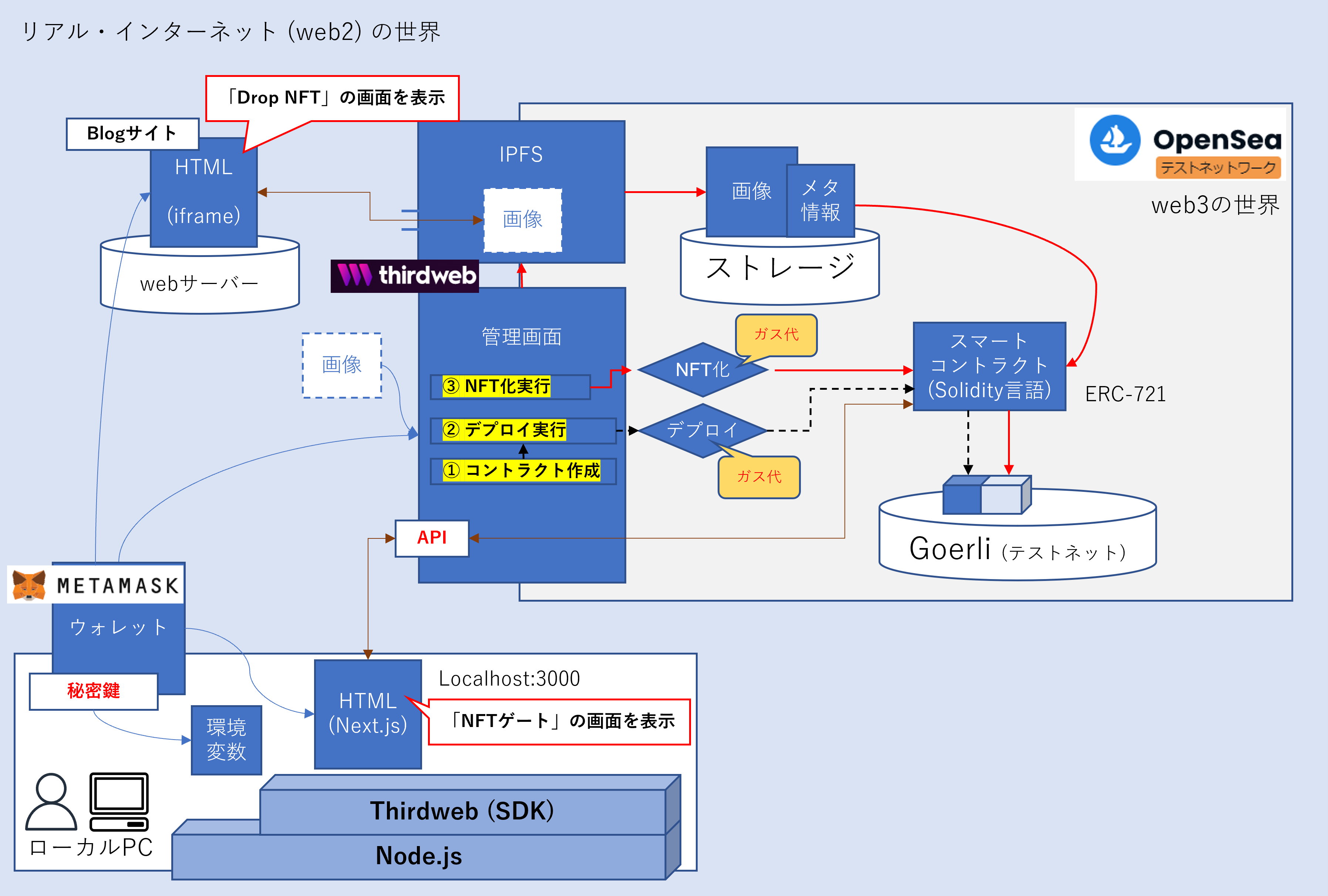 最後に今回のシステム概要図を書いてみました。改めて書いてみるとまだまだ理解できていない部分がありますね。「thirdweb」がweb2とweb3の架け橋になっていて開発者にとっては、便利な開発プラットフォームだと思います。ちなみに収益は、2次流通した金額の5%を請求するのみだそうです。