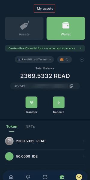 ① アプリ下段のメニューからウォレットアイコンを押下して、My assets 画面に遷移。