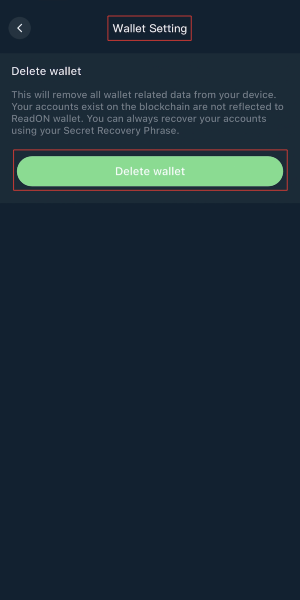 ④ [Deleate wallet] を押下し、ReadONアプリとMetaMaskウォレットの連携を解除 (削除) 。([<] ボタンで戻る)