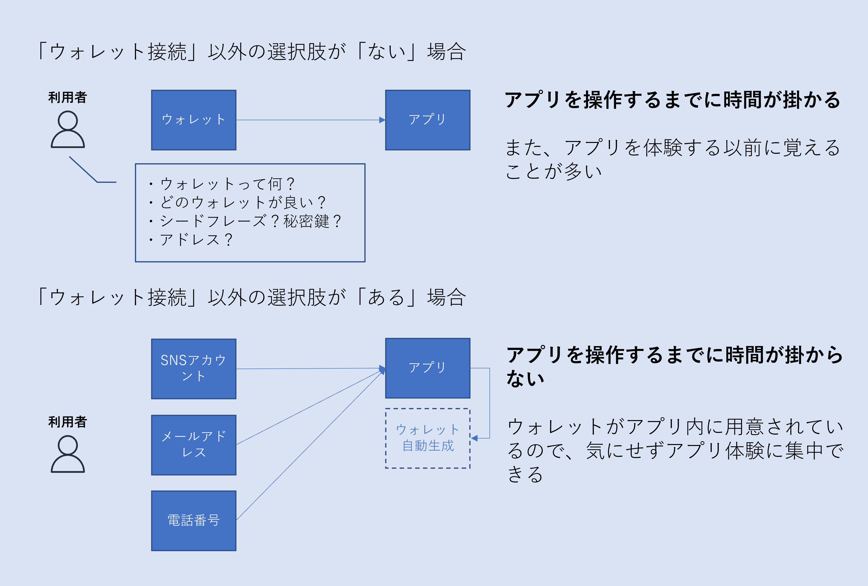 前提として分散型アプリケーション (DApps) を利用するには、事前にウォレットが必要です。特にブラウザーアプリの場合は。執筆時点では、まだ、ウォレット接続のみしか対応していないDAppsが多い印象です。その為、初めてweb3を体験するユーザーが、DAppsを使ってみようとした場合、まず「ウォレットを準備しましょう」から始める必要があり、プレイまでに手間と時間が掛かります。その問題を解決したサービスです。