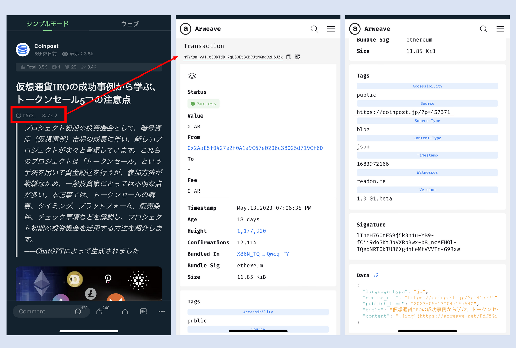 「ReadON」では、国内・国外のweb3に関するニュースや記事、Twitterの情報を読むことができます。ところで「ReadON」アプリで表示されている記事データは、どこに存在しているのでしょうか?「ReadON」アプリで適当に記事を表示し、記事タイトルの下部を見ると英数字の文字列が並んだ表記があります。どうやら、元サイトのURLを直接参照せず、どこかのオンチェーン上に存在してそうです。