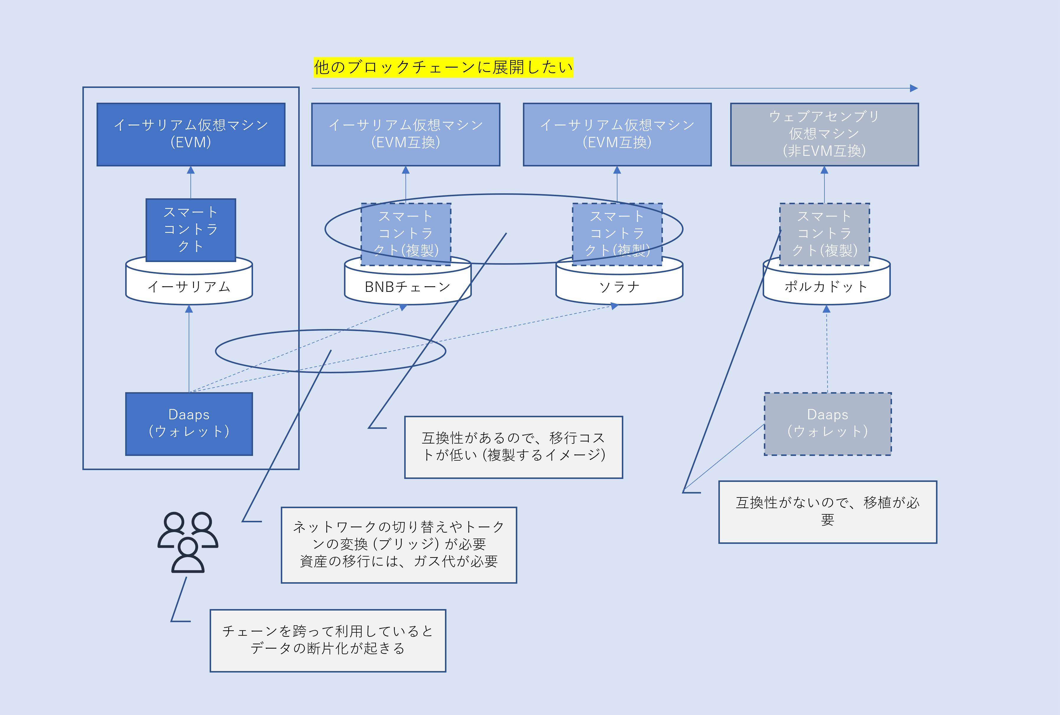 そもそもブロックチェーンは、イーサリアム以外にBNBチェーン・ソラナなどいくつか種類があります。そして、それぞれのチェーンに対応した規格でスマートコントラクトを用意する必要があります (互換性を持っているケースもある)。また、使える暗号通貨もそのチェーンごとに用意されています。その為、複数チェーンを横断したサービス設計にするとアプリ開発者とアプリ利用者が不便になりそうです。