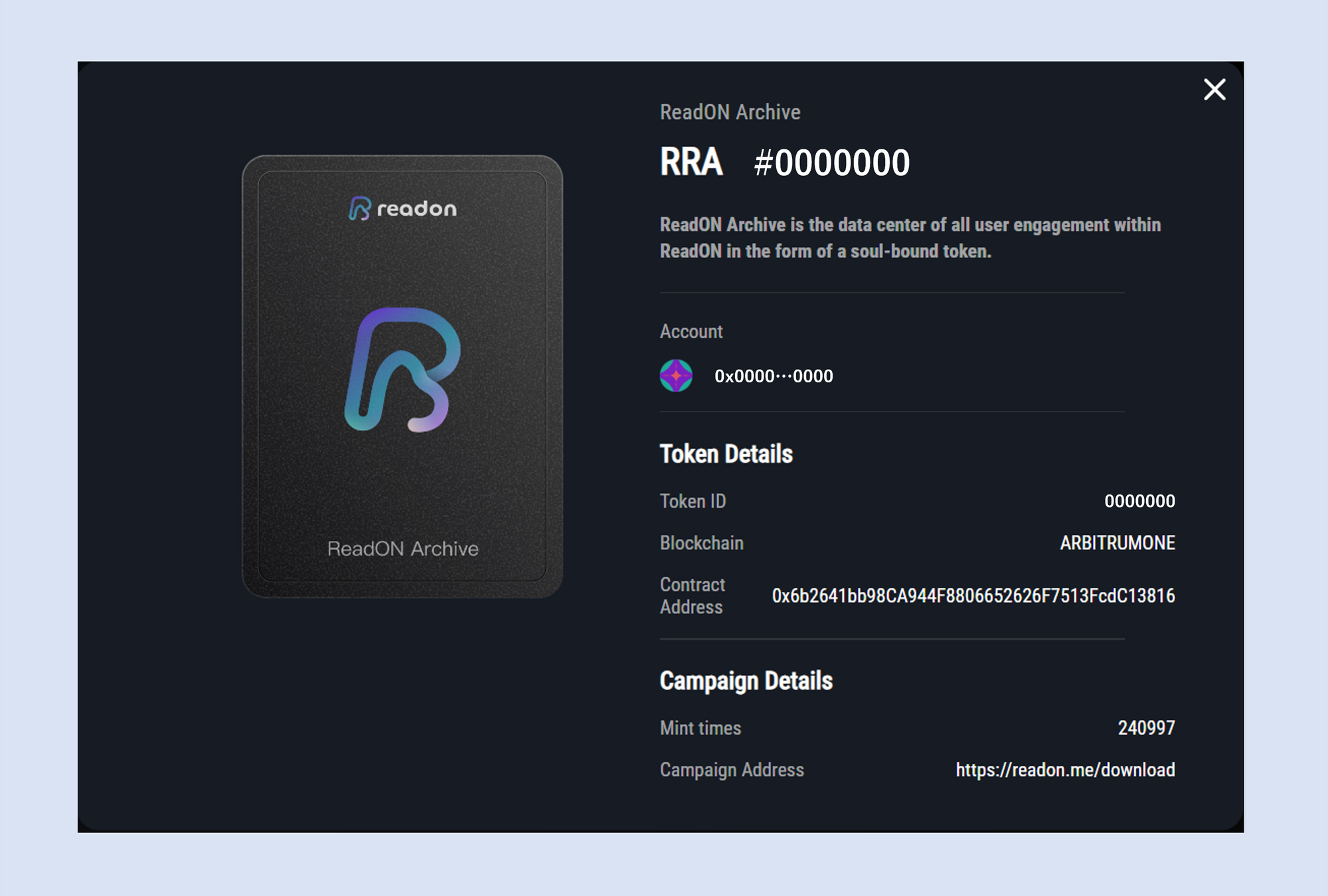 「Read ON」アプリをインストールして初期設定の段階で「ReadON Archive」を作成しました。これは、同梱されているウォレットのアドレスに紐づいて自動生成された譲渡不可能なNFTです。Soulboundトークン (SBT) とも呼ばれます。