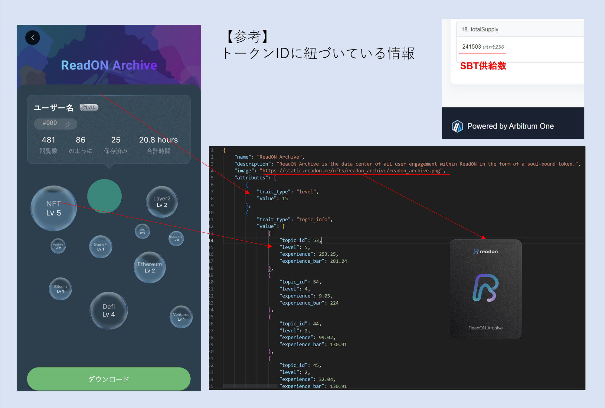 例えば、「ReadON」で読書をすると経験値が増えレベルが上がるのですが、その情報が紐づいていました。トピック別で管理されています。このNFTは「Arbitrum」で発行されているので「Arbiscan」で確認できます。