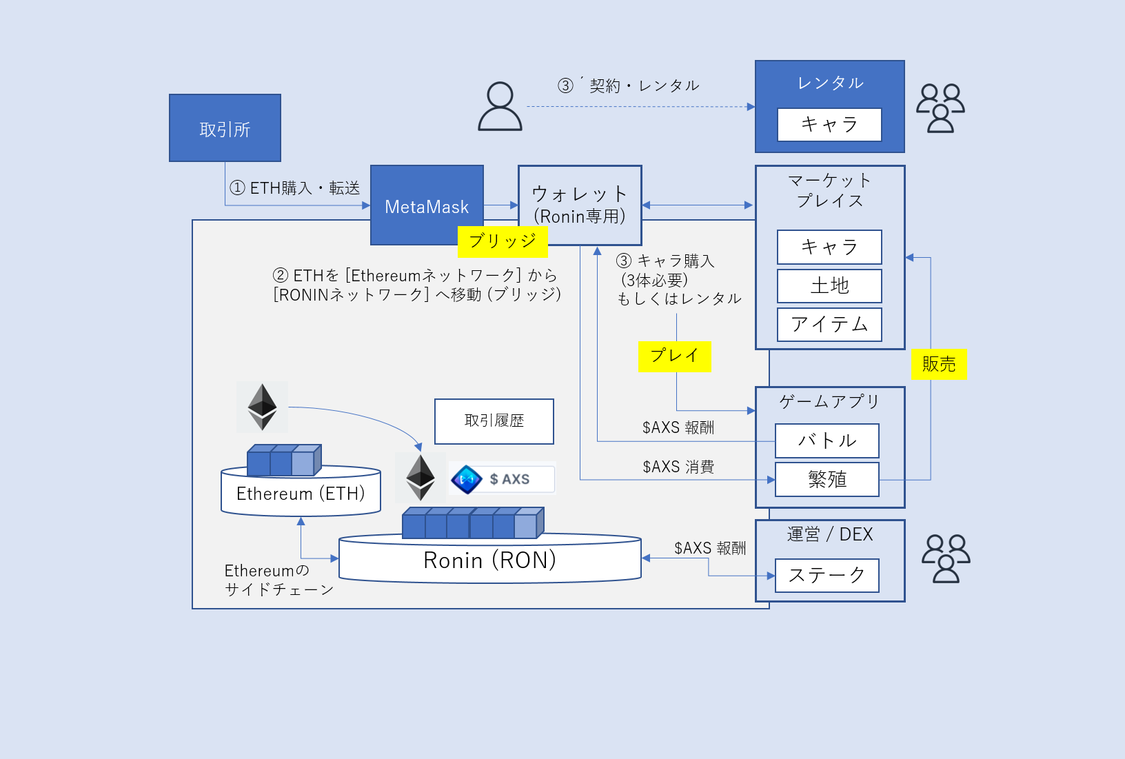 Ronin ネットワークは、ゲーム開発元が独自に構築しています。規格はイーサリアムに則っています。このネットワークを介してウォレット、マーケットプレイス、分散型取引所を繋ぎ全て自社のサービスで運営している状態です。