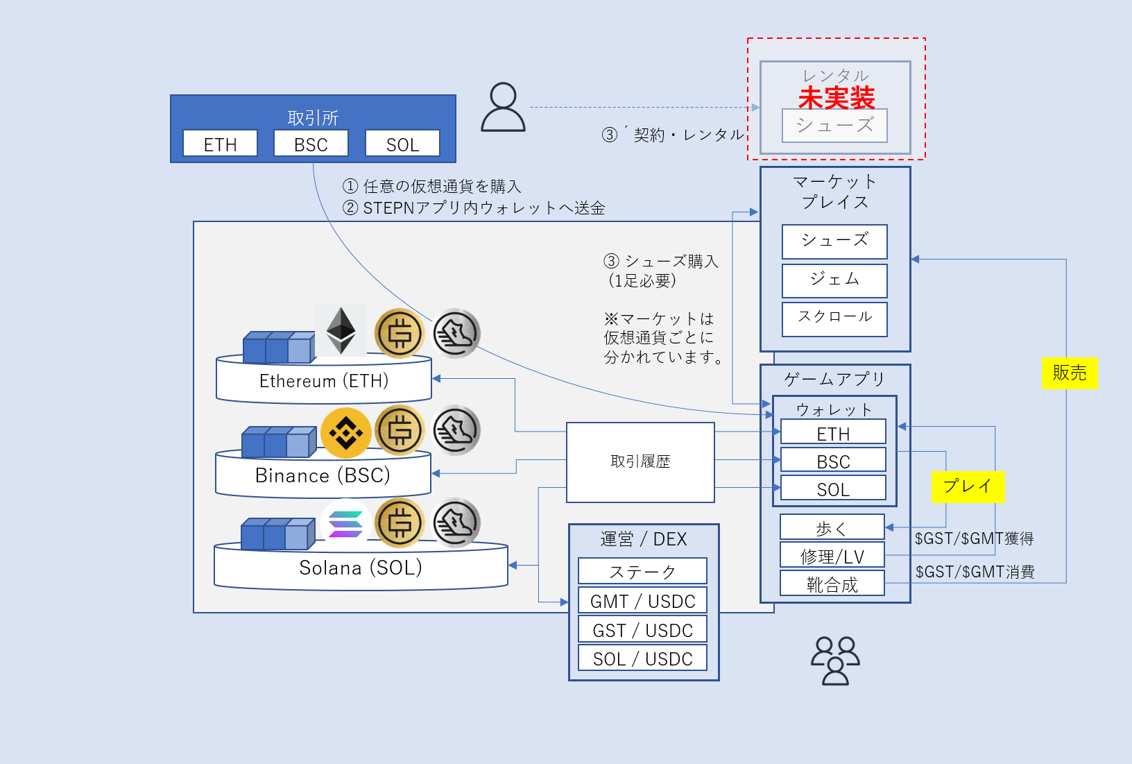 また、ウォレットについては「STEPN」アプリに内蔵されており、事前準備の必要がなくプレイできます。 ユーザー体験が少し緩和されています。 その他、マーケットプレイスと分散型取引所(ソラナのみ)を構築しているようです。